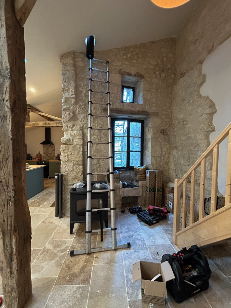 Op dinsdag stonden er twee belangrijke zaken op de rol. Allereerst opende de nieuwe bakker in het dorp. We stonden als eerste klanten op de stoep en het brood en de croissants waren echt verrukkelijk. Een mooie aanwinst voor het dorp. Daarnaast werd de pelletkachel geïnstalleerd. Dat leverde een ijskoude dag op, want met gaten in het dak en de muur en buitendeuren die de hele dag open en dicht gingen, koelde het flink af. Maar toen hij er eenmaal stond, warmde het gelukkig snel op, al duurde het wel een paar dagen voordat alles een beetje op temperatuur was.